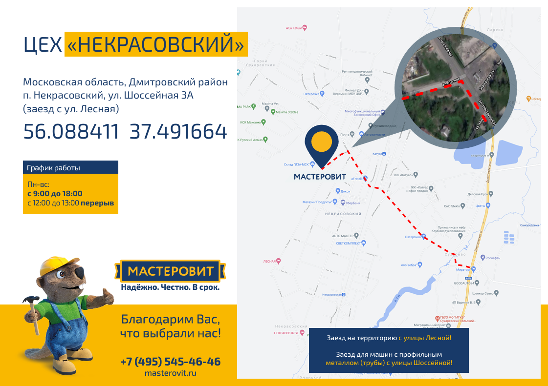 - ТЦ «Строй Сервис», г.о. Солнечногорск, деревня Дубинино, Ленинградское шоссе 59 км.