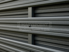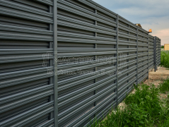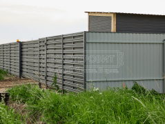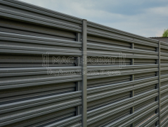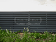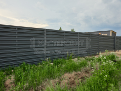 - Установка забора: горизонтальный забор из евроштакетника Finfold, в шахматном порядке, толщина 0.45 мм, двустороннее бархатное покрытие, цвет RAL 7024 (графит); профлист С8, толщина 0.4 мм, одностороннее покрытие, цвет RAL 7024 (графит).