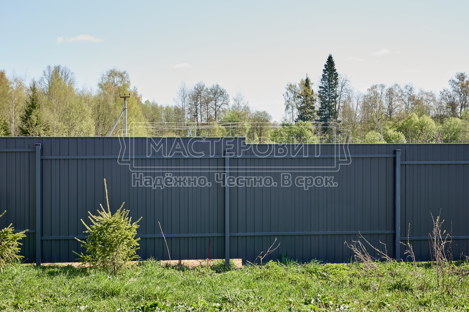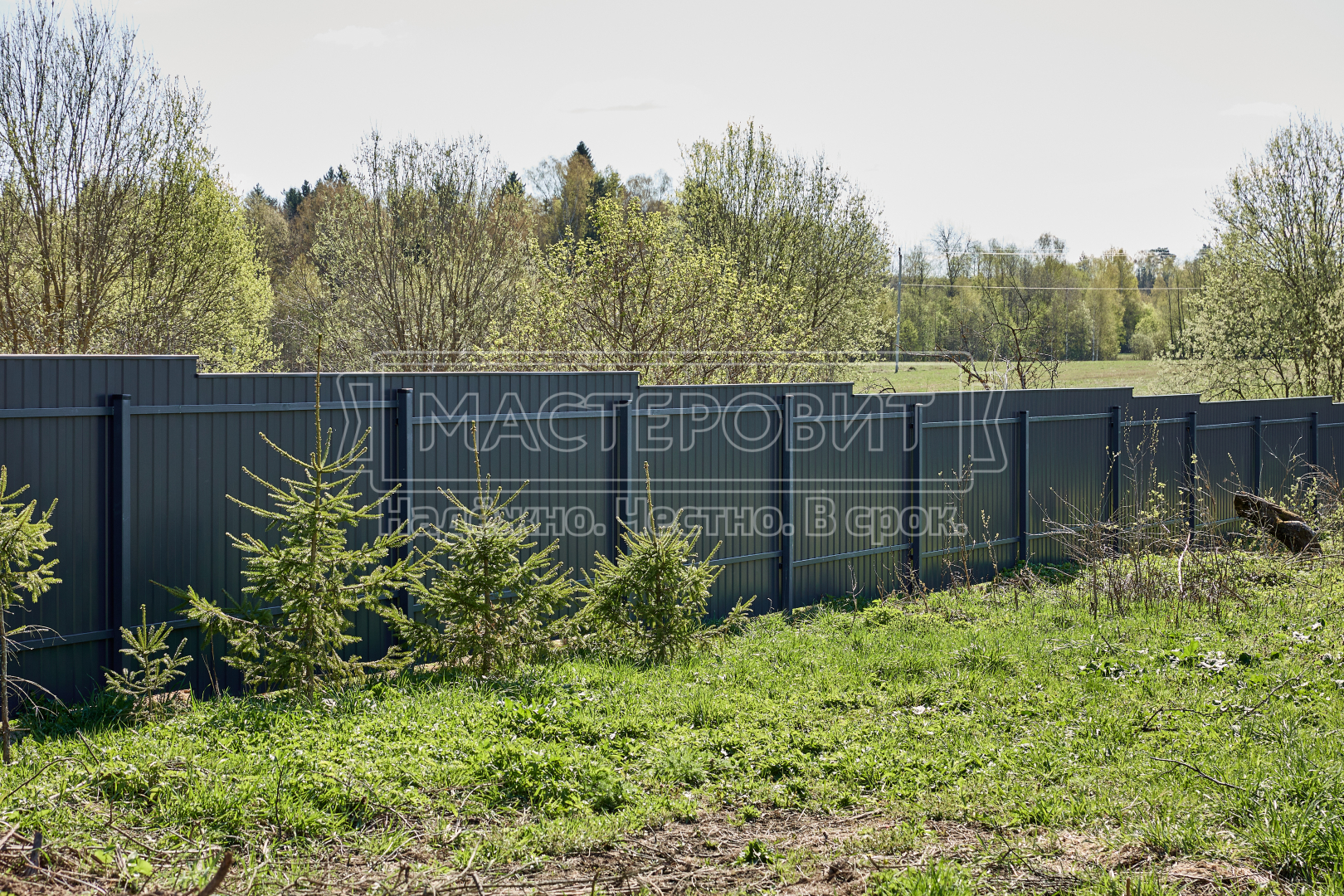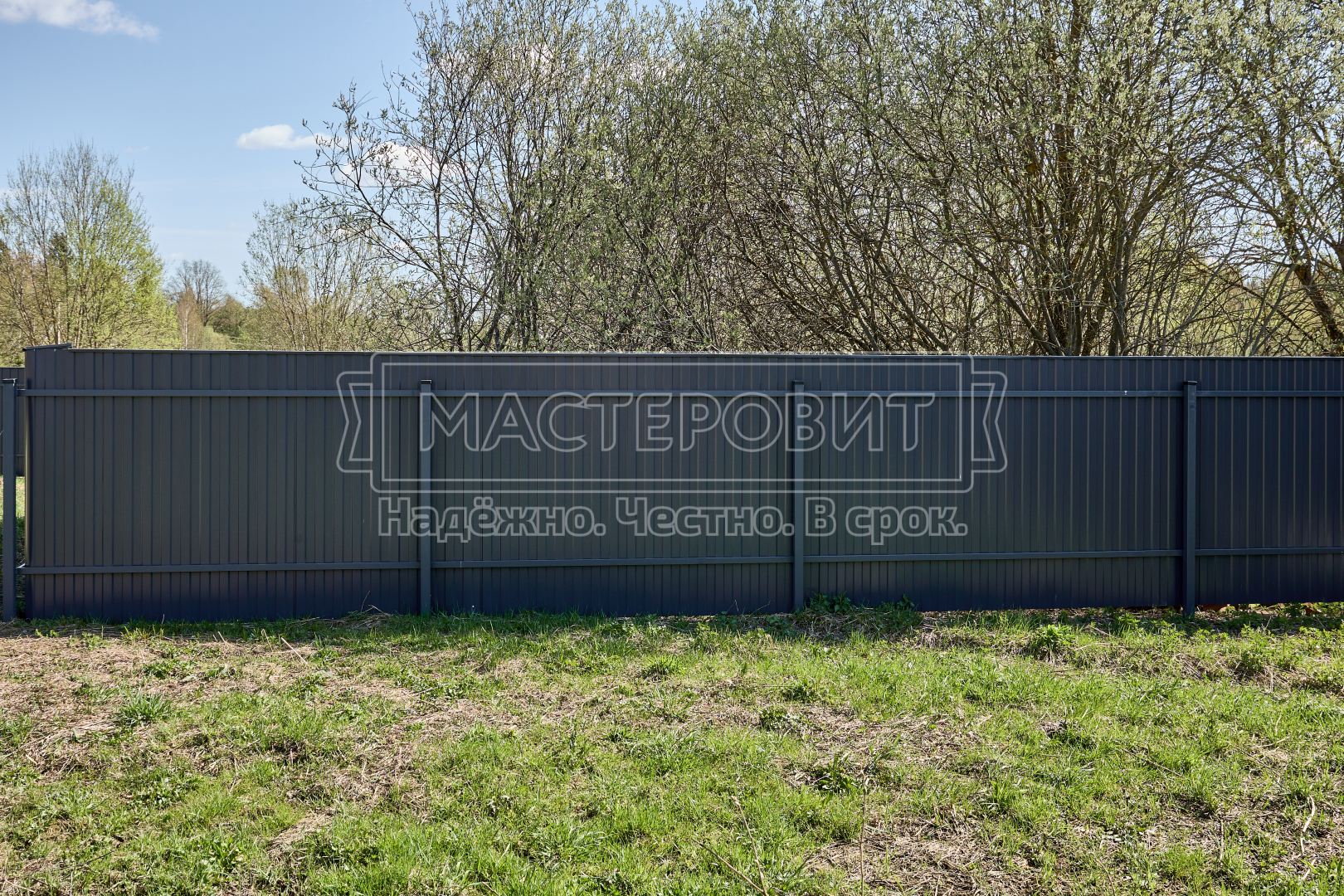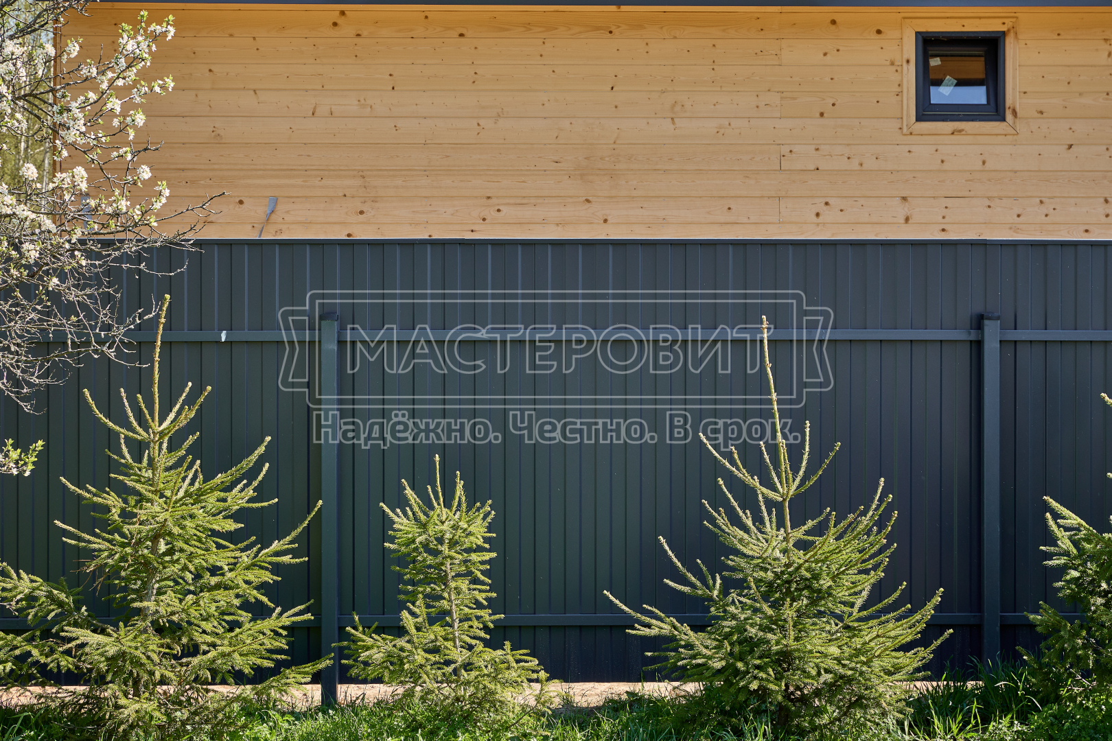 - Установка забора: вертикальный забор из евроштакетника Finfold, толщина 0.45 мм, двустороннее порошковое матовое покрытие, цвет RAL 7024 (графит); профлист С8, толщина 0.45 мм, двустороннее покрытие, цвет RAL 7024 (графит).