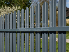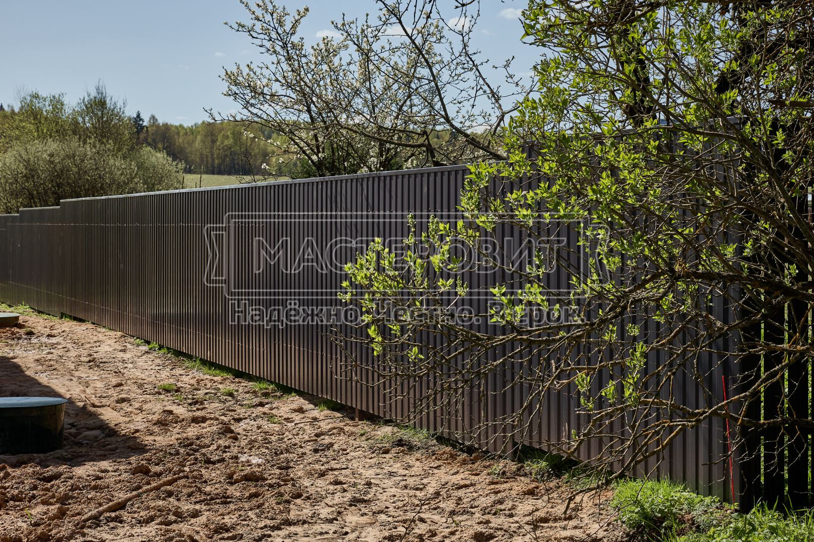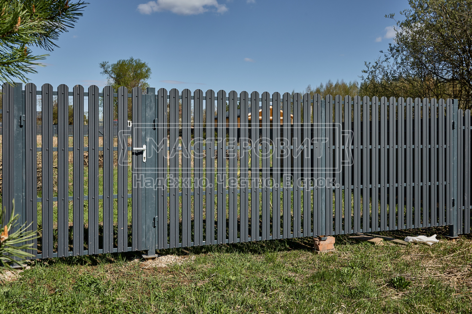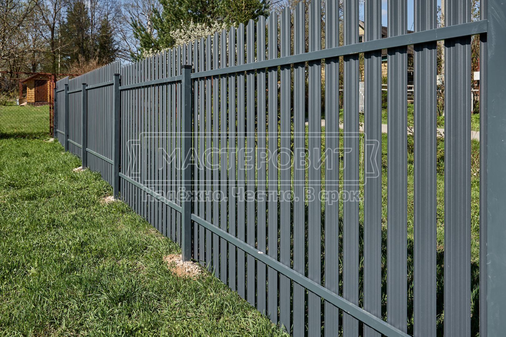 - Установка забора: вертикальный забор из евроштакетника Finfold, толщина 0.45 мм, двустороннее порошковое матовое покрытие, цвет RAL 7024 (графит); профлист С8, толщина 0.45 мм, двустороннее покрытие, цвет RAL 7024 (графит).