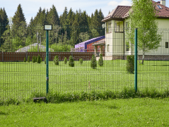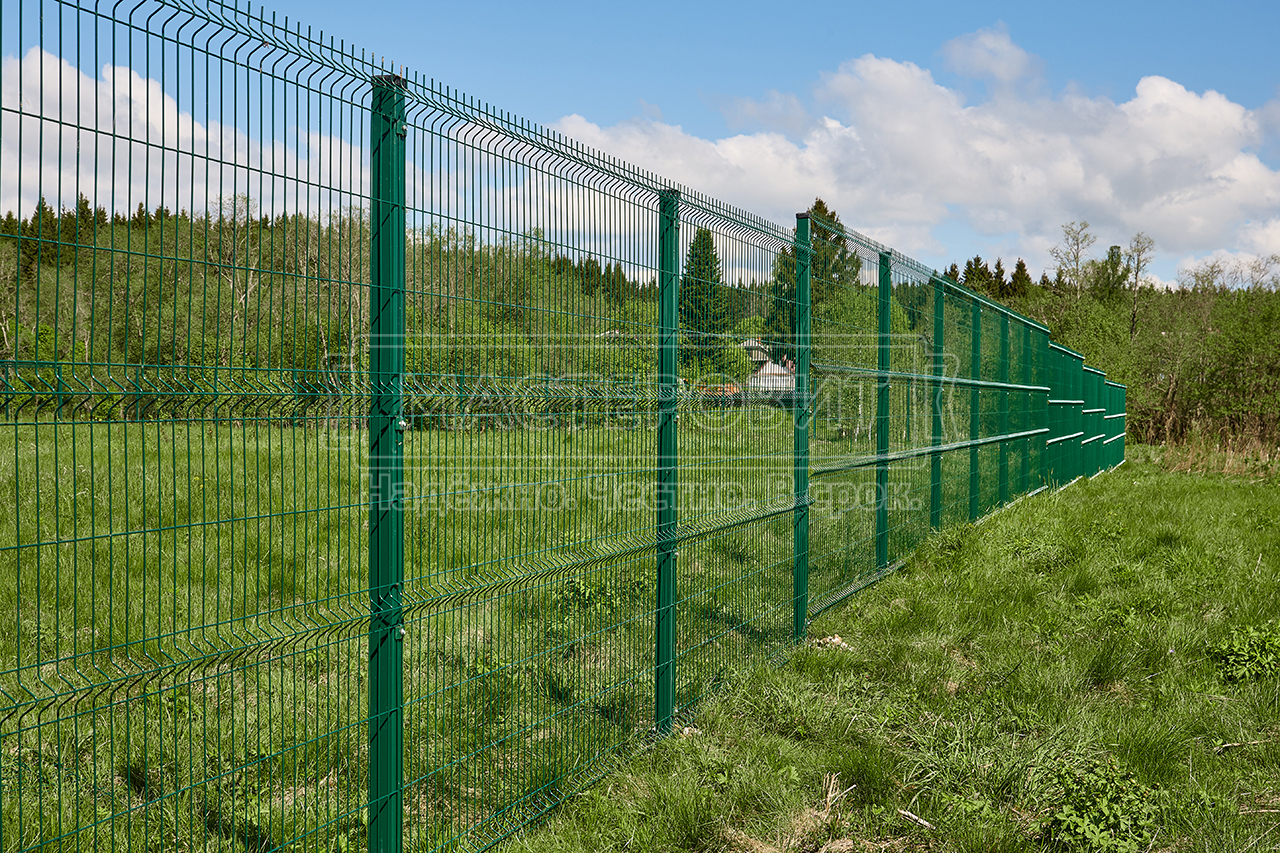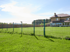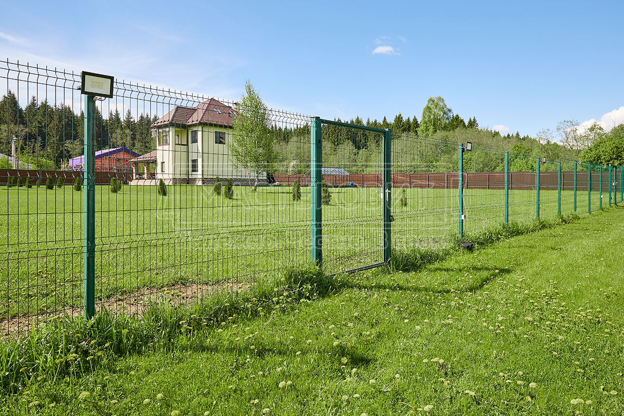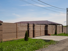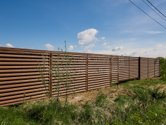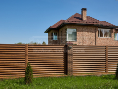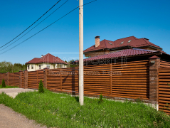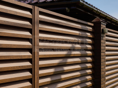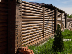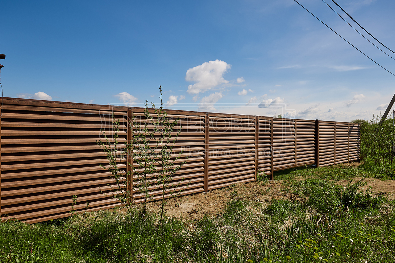 - Установка забора: ламели Модерн, толщина 0.45 мм, двустороннее покрытие Морёный дуб; профлист С8, толщина 0.45 мм, двустороннее покрытие Морёный дуб; оцинкованный забор 3D, полимерное покрытие, цвет RAL 6005 (зелёный мох), диаметр прутка 4 мм.