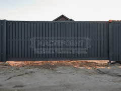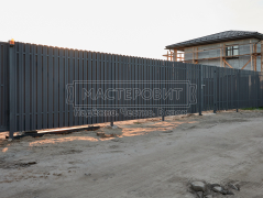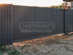 - Установка откатных ворот: размеры 5000 мм х 1950 мм, рама из Т-образного профиля, два столба 80х80 толщиной 3 мм и винтовые сваи "Шуруп".
