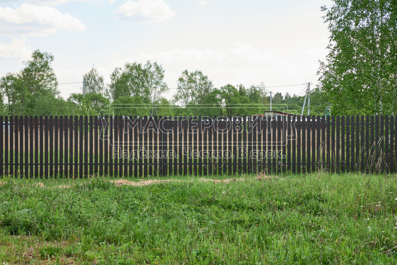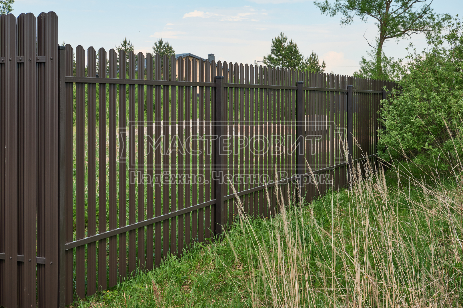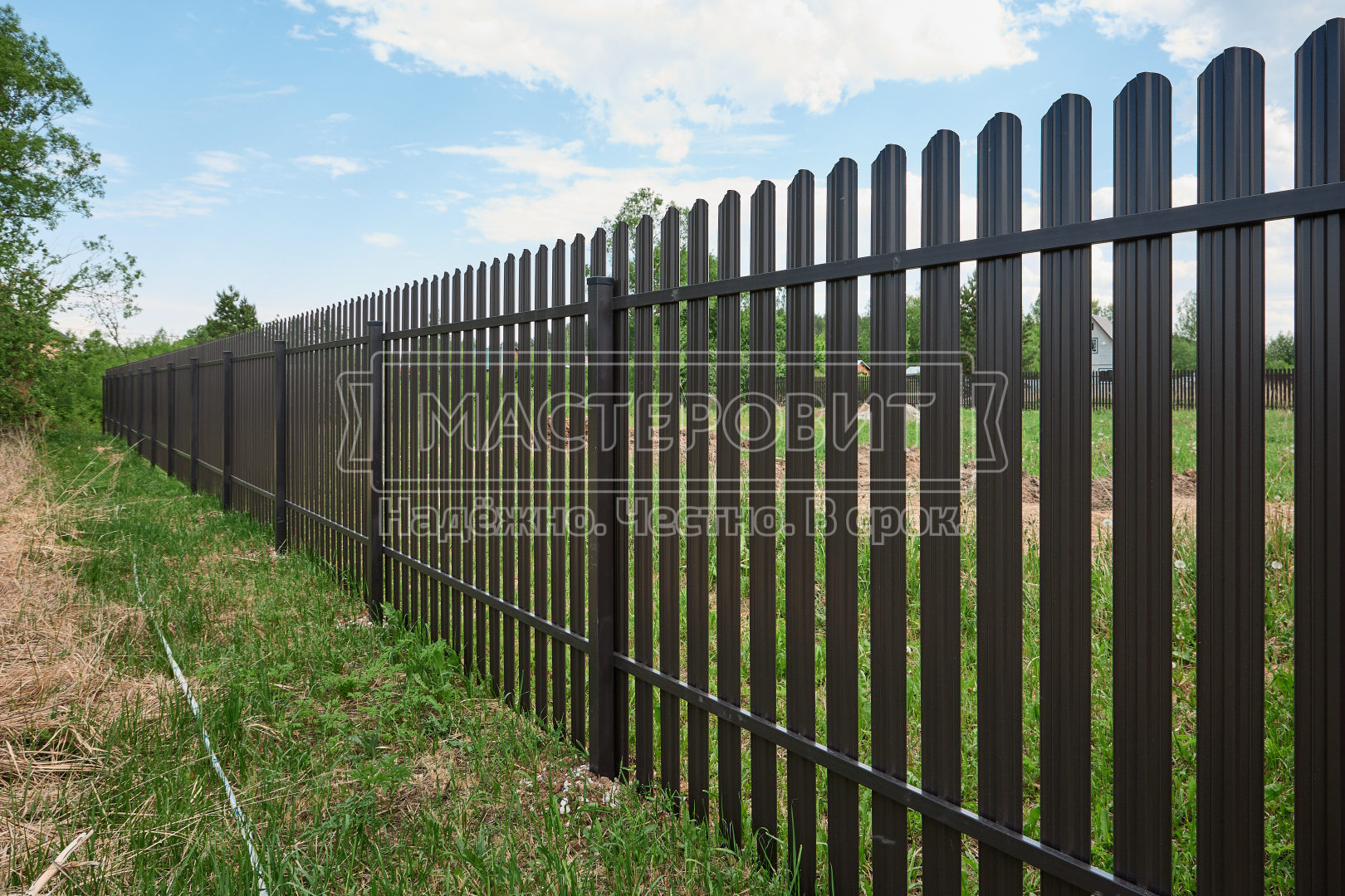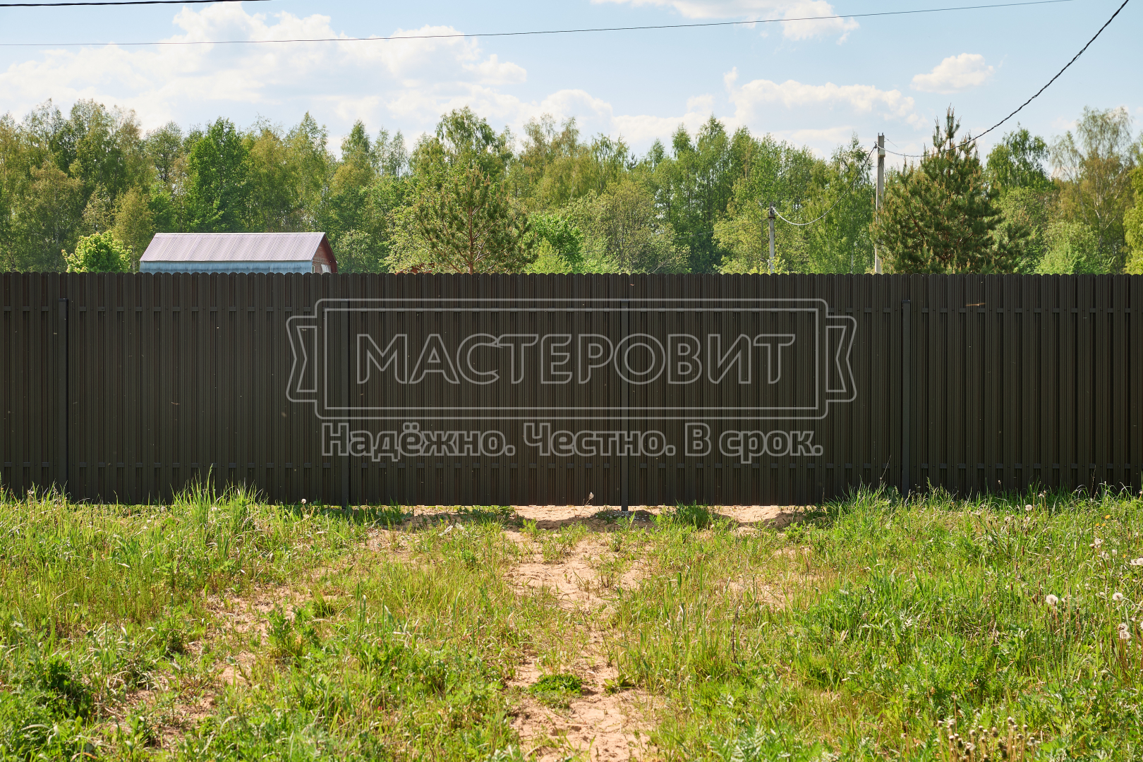 - Установка забора: вертикальный забор из евроштакетника Finfold, часть секций в шахматном порядке, толщина 0.45 мм, двустороннее покрытие, цвет RAL 8019 (серо-коричневый).