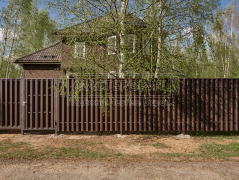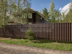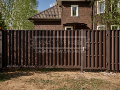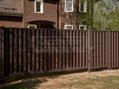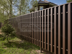 - Установка забора: вертикальный забор из евроштакетника, П-образной формы, в шахматном порядке, двустороннее порошковое матовое покрытие, цвет RAL 8019 (серо-коричневый).
