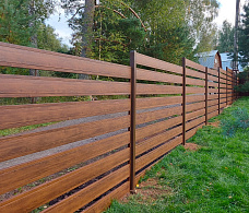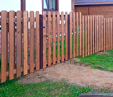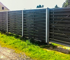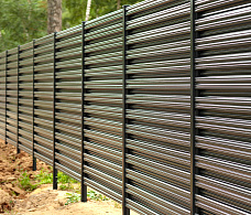 Металлический штакетник: односторонний Finfold «Морёный дуб», толщиной 0,45 мм, шириной 100 мм, с зазором 2 см