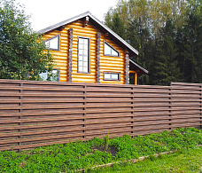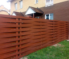Металлический штакетник: односторонний П-образный «Темный дуб», толщиной 0,35 мм, шириной 120 мм, с зазором 2 см