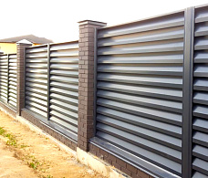 Строительство заборов из металлического штакетника возможно в разных конфигурациях монтажа. Они позволяют изготавливать не только просматриваемые, но и сплошные ограждения. Это помогает подобрать нужный по стилю и функционалу вариант, заказывая заборы под ключ. Минусом глухих конструкций из металлического штакетника является цена — более высокая, чем у профнастила.