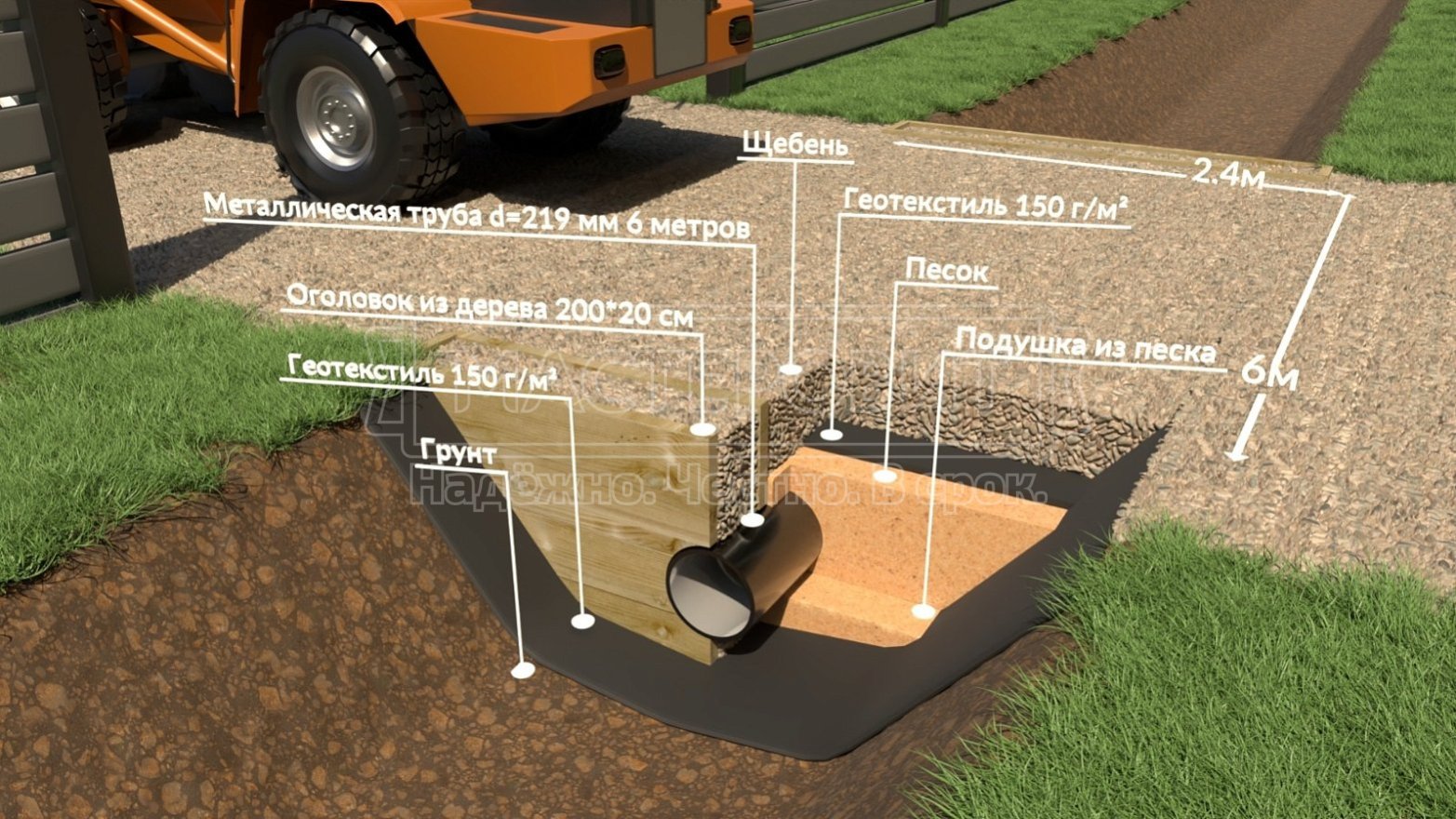 Конструкция заезда типа «Стандарт грузовой» формируется на базе дренажной трубы, установленной в теле канавы.