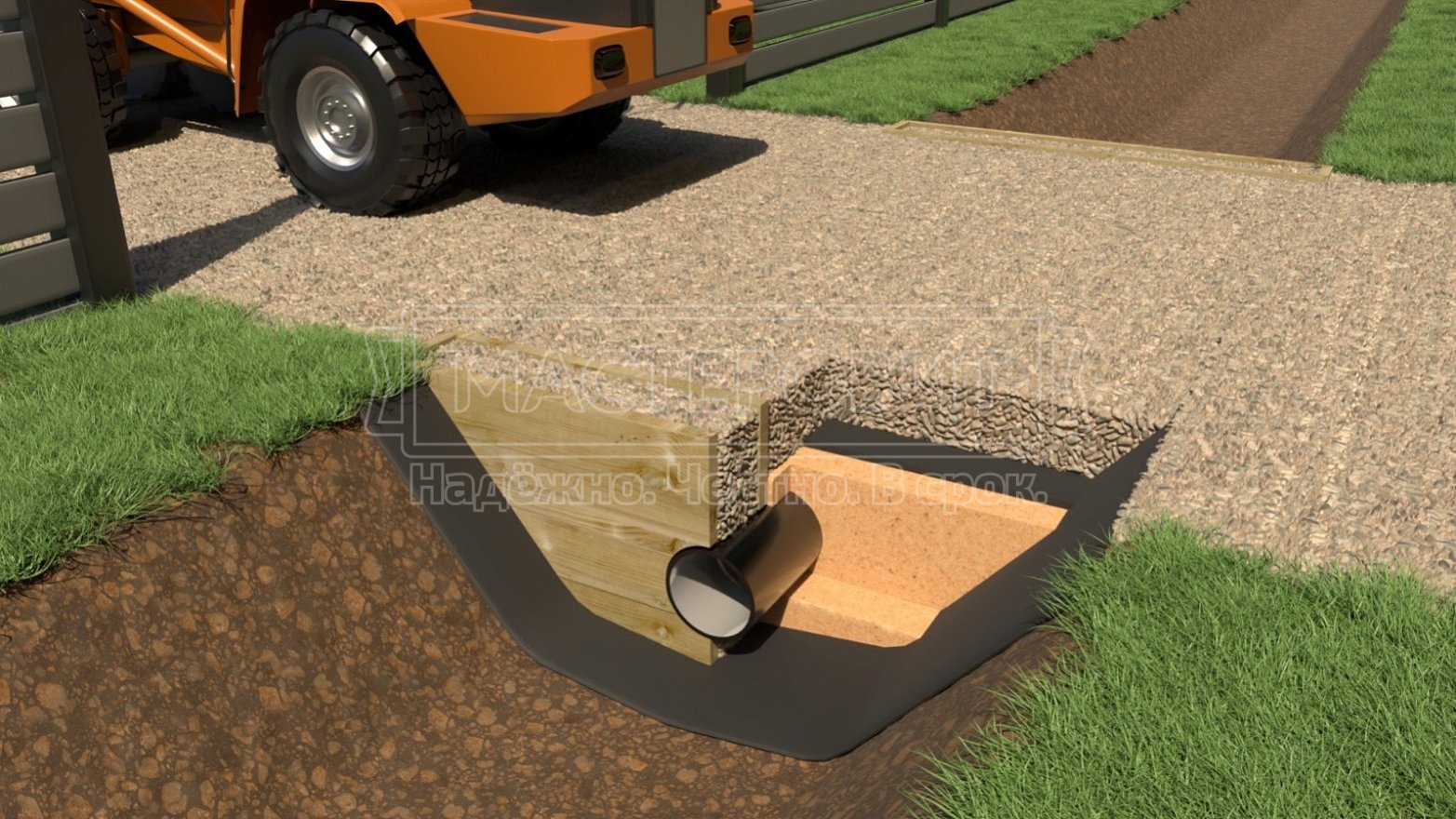 Края заезда укрепляются деревянными оголовками — это короб из доски 200×20 см, окрашенной в черный цвет.